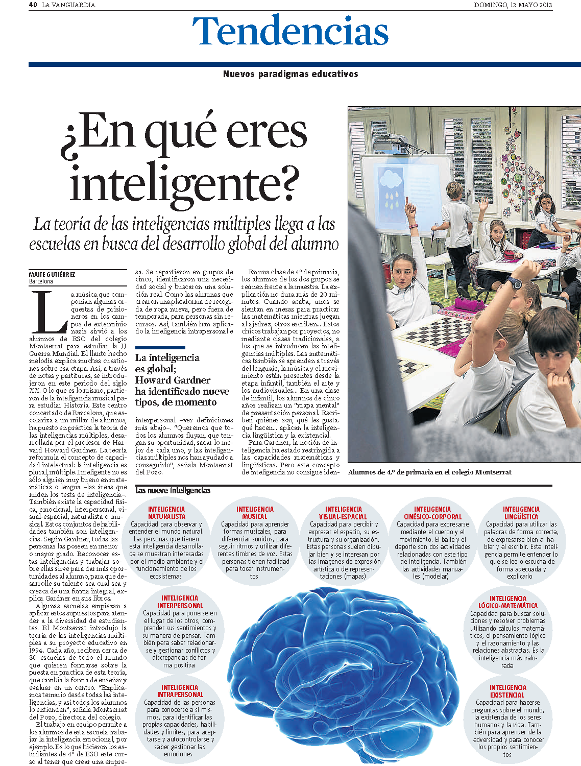Si tens una habilitat o ets bo en quelcom, es pot dir que ja ets intel·ligent. I no ho ets en el sentit més antic de la paraula, sinó en el que relaciona, segons estudis dels darrers anys, les diferents habilitats de les persones amb les 9 intel·ligències diferents que es coneixen fins el dia d’avui. Segons el professor Harvard Howard Gardner, la intel·ligència és plural, i múltiple també, ja que la intel·ligència no consisteix només en el bo que és cadascú només en matemàtiques o llengua -àrees que actualment s’utilitzen per fer els test d’intel·ligència típics-, sinó que pots ser especialment bo en altres àrees del mateix valor com són: físic, emocional, interpersonal, visual-espaial, naturalista o musical. Així doncs, aquest conjunt d’habilitats particulars que pot tindre qualsevol persona, fins i tot els alumnes de les escoles que encara s’estan formant, engloben el que es coneix com les 9 intel·ligències: